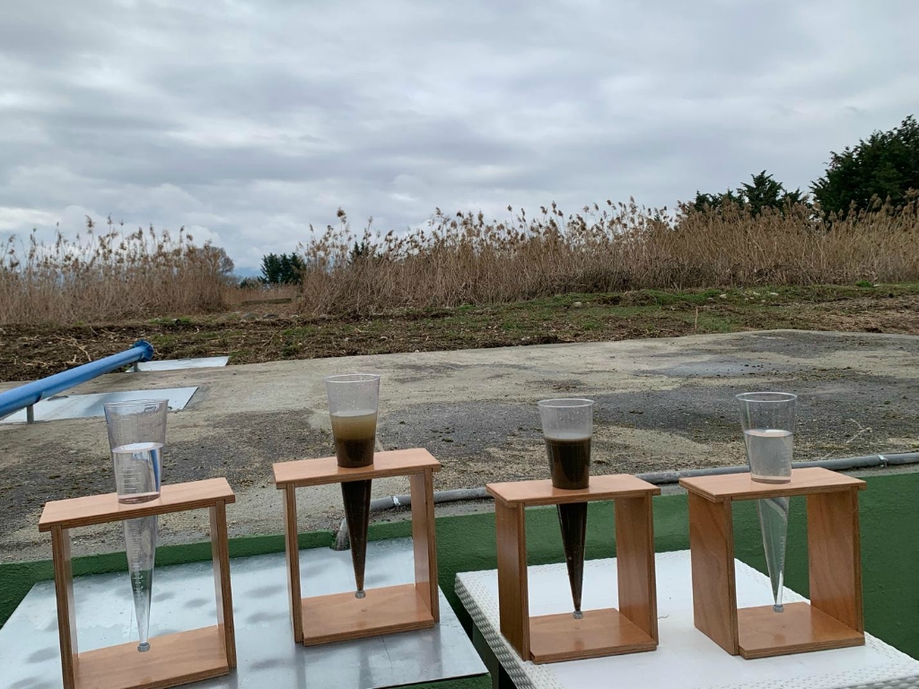 La prima da destra contiene acqua del rubinetto servita dal gestore, nella seconda quella che arriva all'entrata dell'impianto, nella terza come si presenta dopo i primi trattamenti, nell'ultima quella che esce e si immette nei canali del Fucino.
