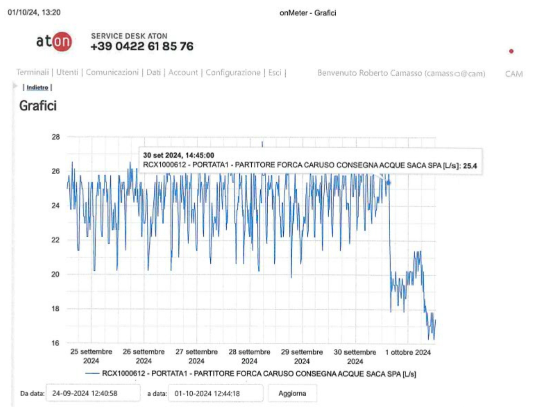 Si avvisano gli Utenti che dal giorno 30/09/2024, alle ore 17:00 circa la portata in transito presso il partitore di “Forca Caruso” si è ridotta inaspettatamente a 19,4 litri secondo rispetto ai soliti 24-25 circa. Tale situazione può essere stata provocata solamente da una rottura imprevista della condotta idrica di adduzione “Ferriera” che a causa di una perdita idrica localizzata a valle del sistema ha provocato una perdita di carico con conseguente calo della portata.